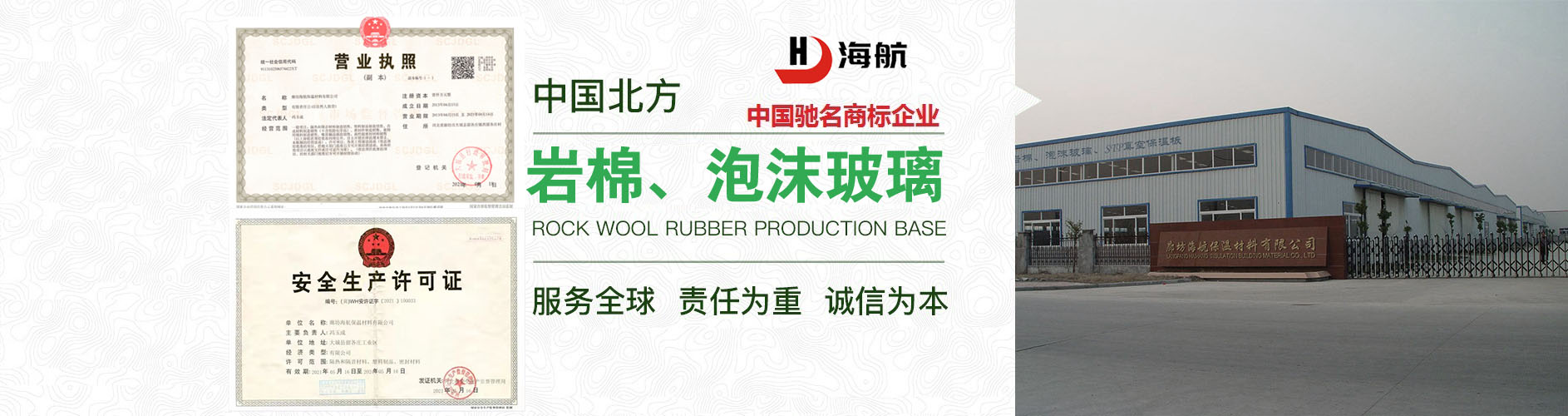 廊坊市海航保溫材料有限公司 地處河北廊坊留各莊高新技術產業(yè)園區(qū),是集研發(fā)、生產和銷售于一體的大型企業(yè),擁有11年保溫建材行業(yè)生產經驗,公司產品齊全,其中泡沫玻璃制品包括: 泡沫玻璃保溫板 、 泡沫玻璃保溫管 、 泡沫玻璃保溫磚 ; 巖棉制品包括 : 巖棉板 、 復合巖棉板 、 外墻巖棉板 、 巖棉氈 、 巖棉條 、 巖棉管 等保溫材料。 產品廣泛應用于地鐵、樓房屋頂、外墻防火隔離帶、石化、發(fā)電、航天、 鋼鐵、煉油、乙烯等行業(yè)的保冷、防腐、工程中。采用世界先進的設備,成熟的工藝生產,智能化操控,廢棄物循環(huán)利用,產品質量超過美國ASTM標準, 公司年產量50萬立方米的泡沫玻璃,80萬立方米橡塑海綿,5萬噸巖棉制品,4萬噸玻璃棉制品,16萬立方米擠塑板